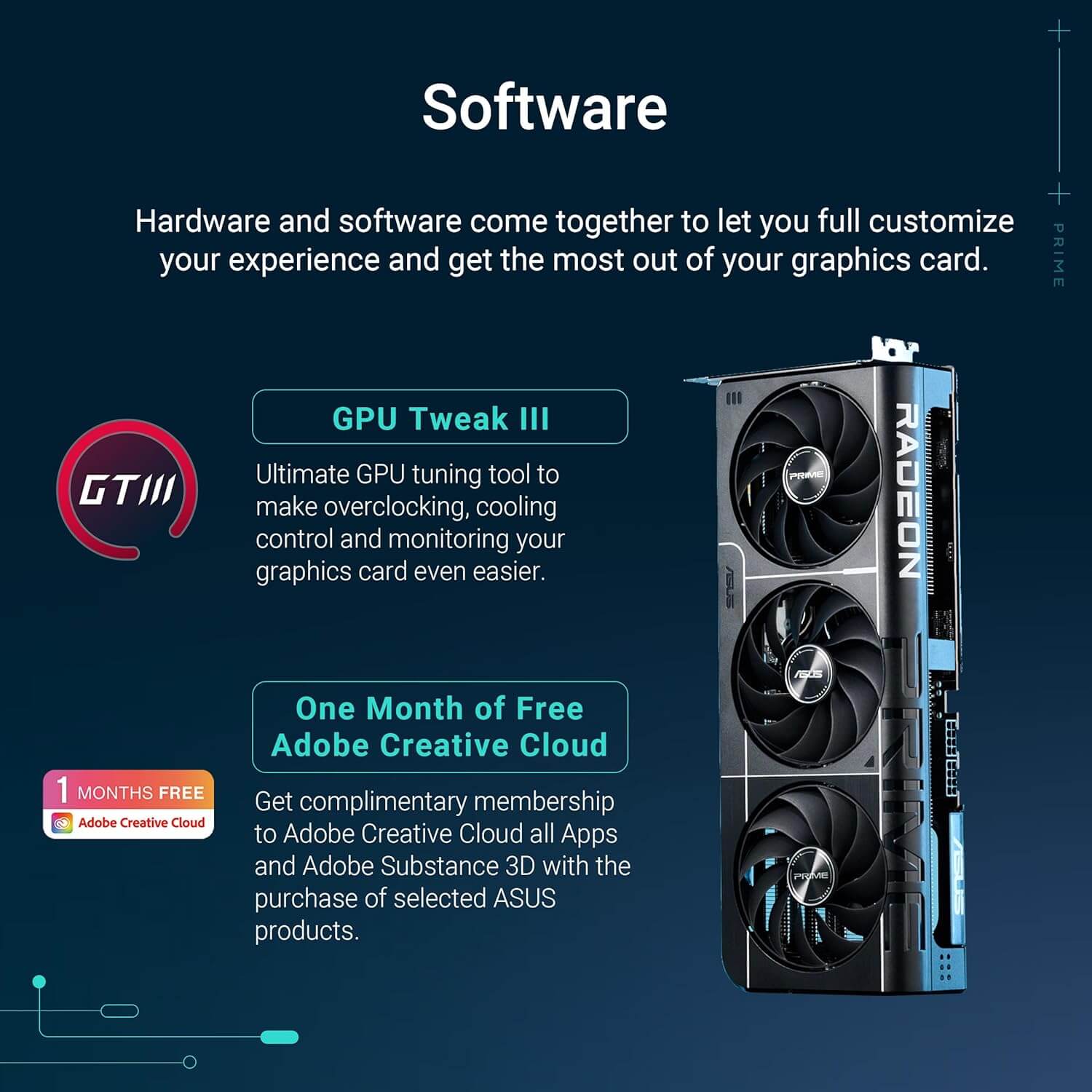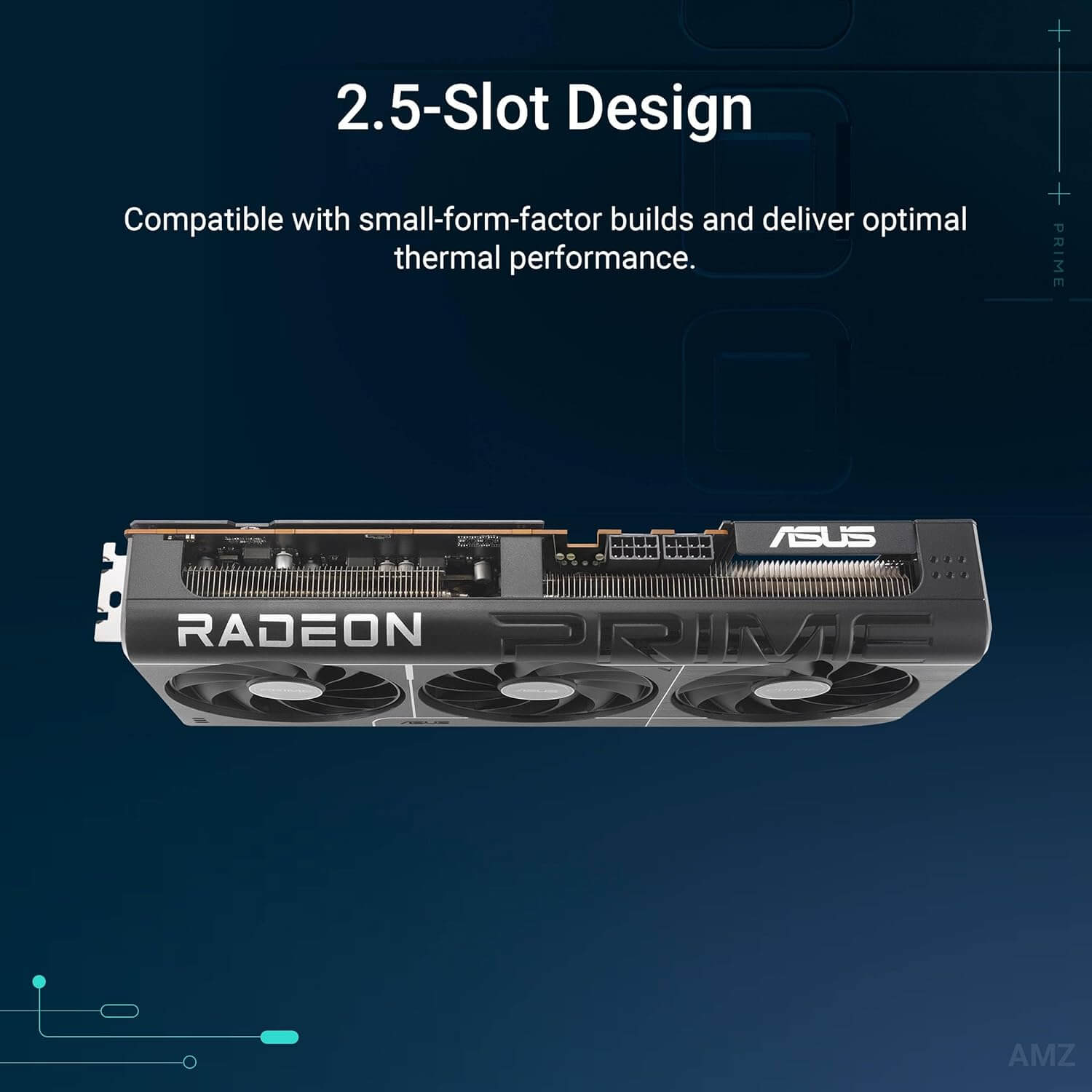 Experience Primal performance with the Prime Radeon™ RX 9070 graphics card featuring a compact 2.5-slot design for expansive compatibility, enhanced by a phase-change GPU thermal pad and a triple-fan setup for supreme cooling.