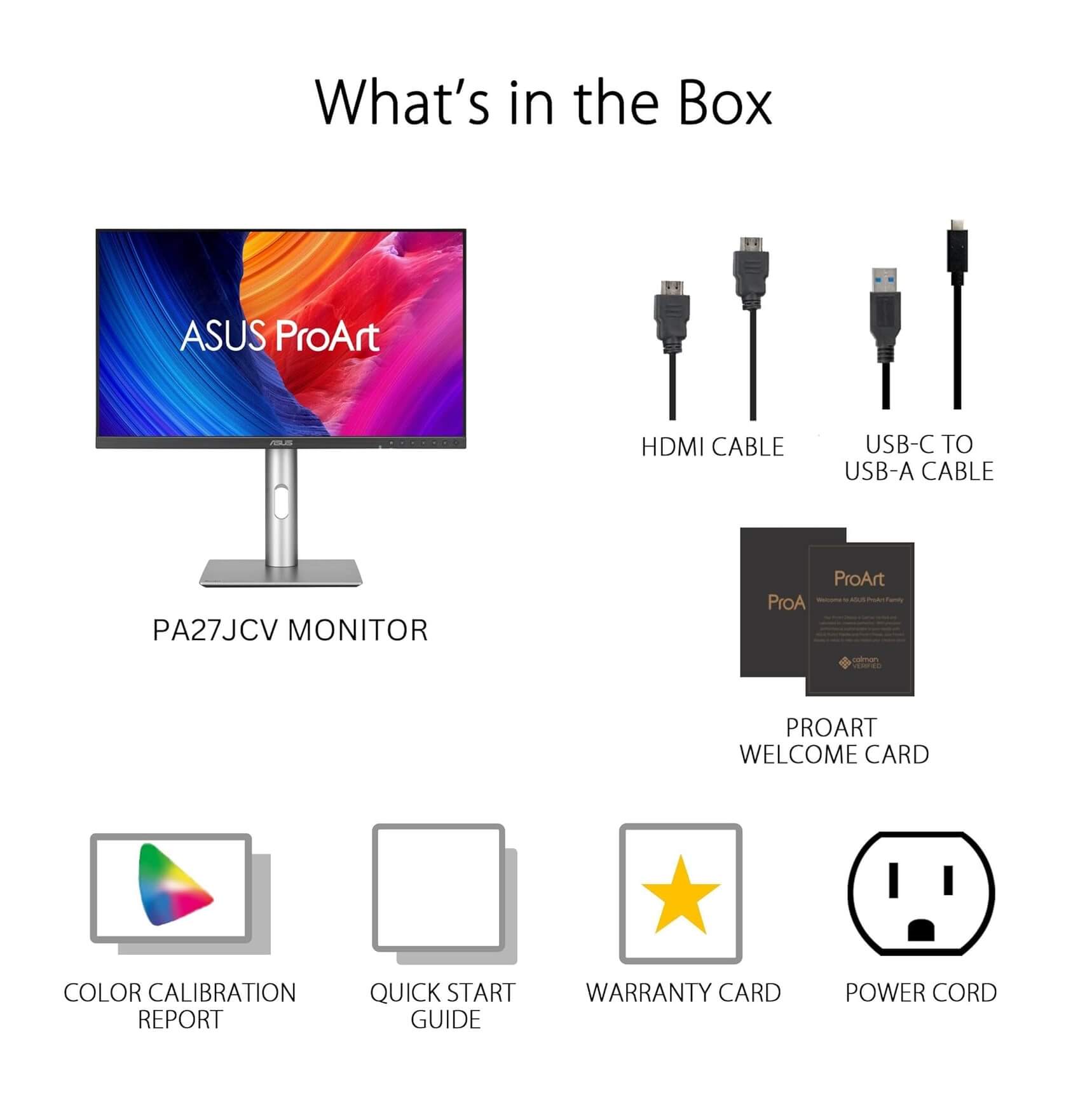 ProArt Display PA27JCV is a 27-inch 5K HDR monitor designed for professional content creators. This Calman Verified display boasts a wide gamut with 99% DCI-P3, 100% sRGB and 95% Adobe RGB coverage, and it's factory calibrated to Delta E<2 for exceptional color accuracy.