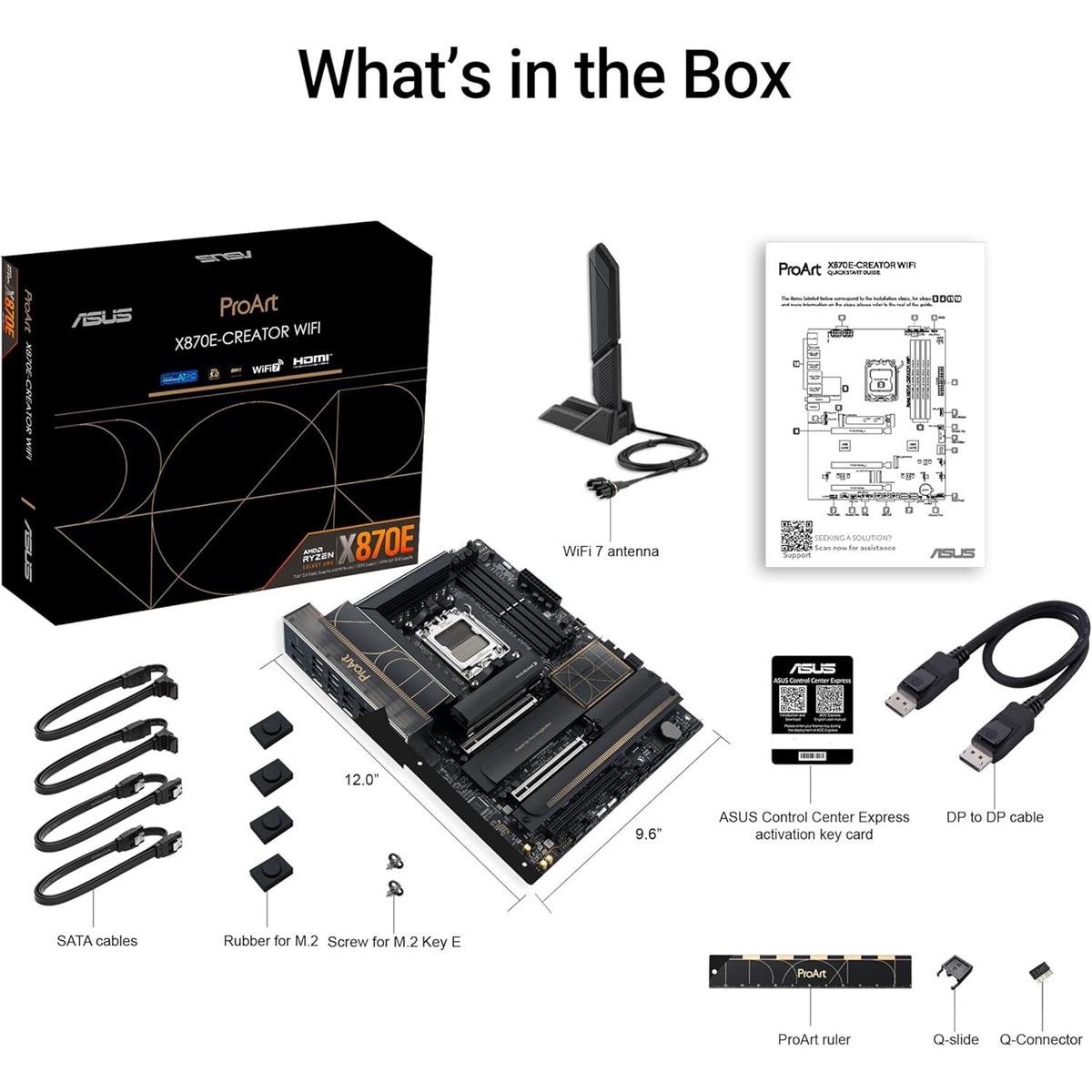 The ProArt X870E-Creator WiFi empowers creators of all levels by maximizing the performance of the latest AMD Ryzen™ 9000, 8000 and 7000 Series processors with 16+2+2 team power stages, DDR5 slots, PCIe®5.0 and lightning-fast connectivity including dual USB4®, 10G and 2.5G Ethernet, and WiFi 7.