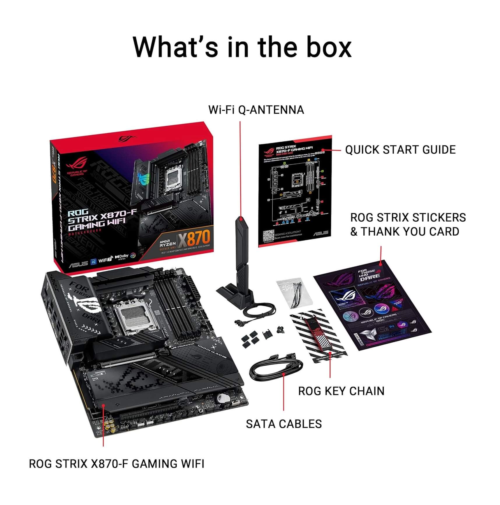 ASUS ROG Strix X870-F Gaming WiFi, AMD ATX motherboard, 16+2+2 power stages, DDR5 slots, four M.2 slots, PCIe 5.0 with full support for next-gen GPUs, WiFi 7, USB 10G w/ PD 3.0 up to 30W