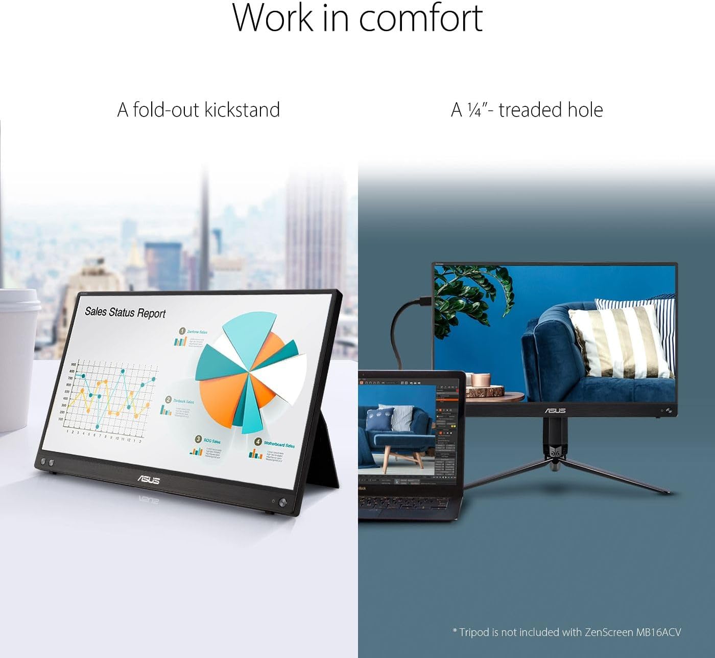 ASUS ZenScreen MB16ACV Portable USB Monitor- 16 inch (15.6 inch viewable) Full HD, IPS, Hybrid Signal Solution, USB Type-C, Blue Light Filter, Anti-glare surface, Antibacterial treatment
