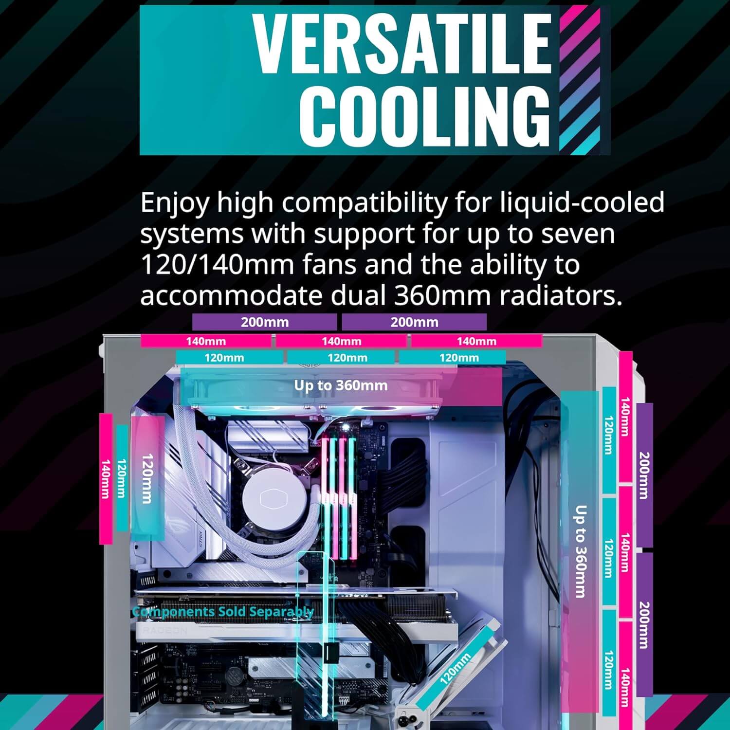 Extensive Cooling Support: Compatible with multiple radiators and fans, including a 360mm radiator at the front, a 280mm radiator at the top, and a 120mm radiator at the rear.