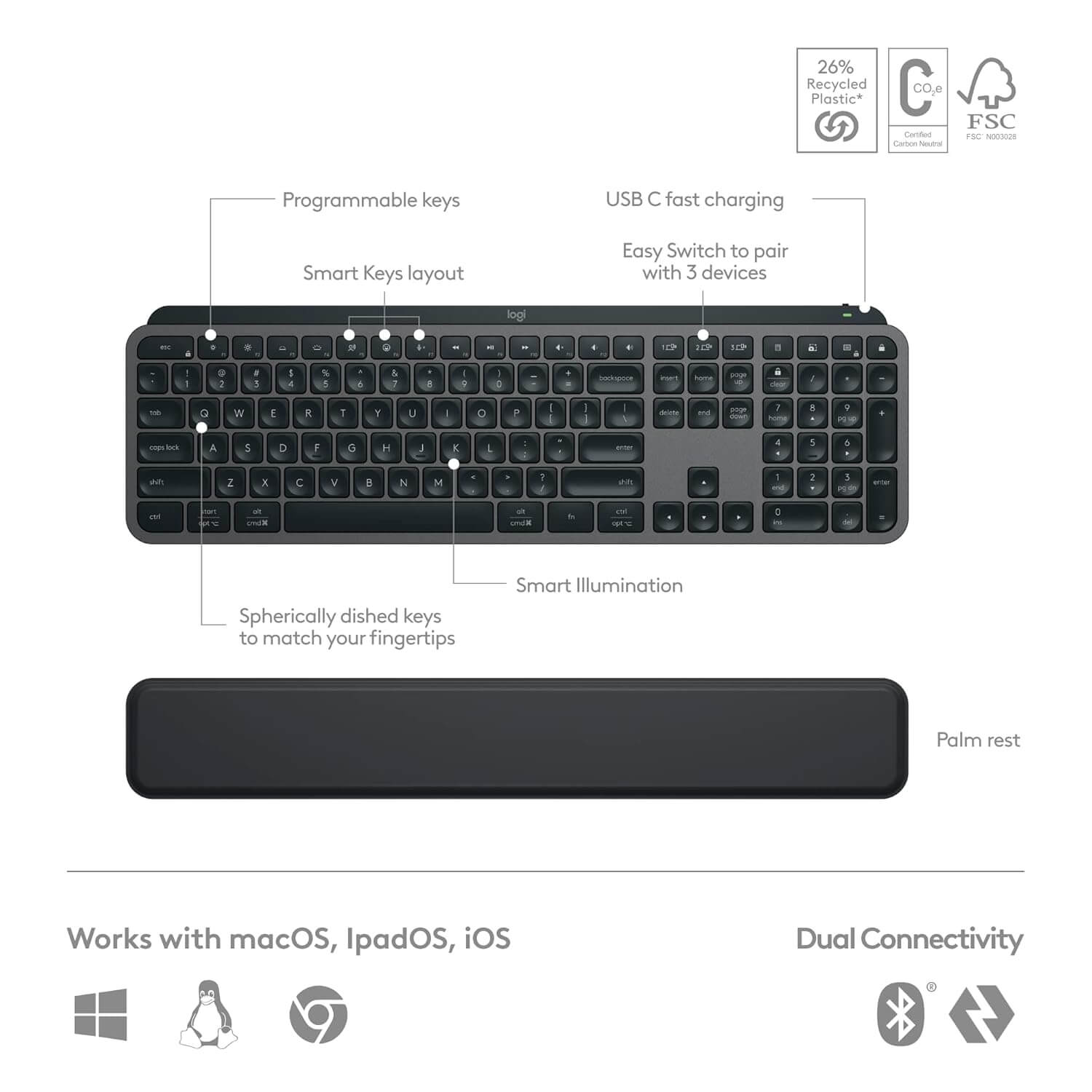 Backlit keys light up when your hands approach and automatically brighten or fade to suit your environment. Control backlighting duration and brightness in Logi Options+ Requires Logi Options+ app, available for Windows and macOS.