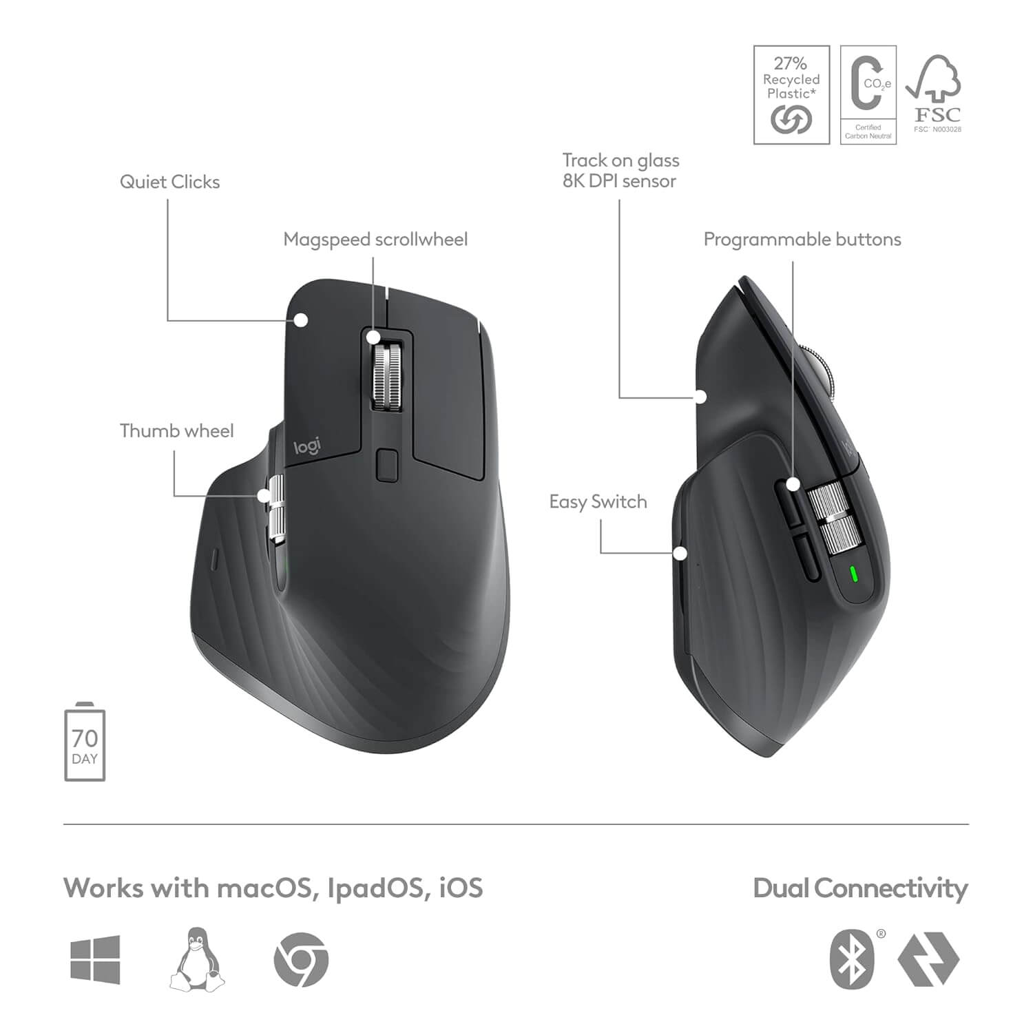 with the Magspeed scroll wheel . 90%11Compared to regular Logitech mouse without an electromagnetic scroll wheel more speed and 87%Compared to Logitech Master 2S mouse with Logitech Options installed and Smooth scrolling enabled more precision with its 2 modes: ratchet & hyper fast scroll (compared to regular Logitech mouse).