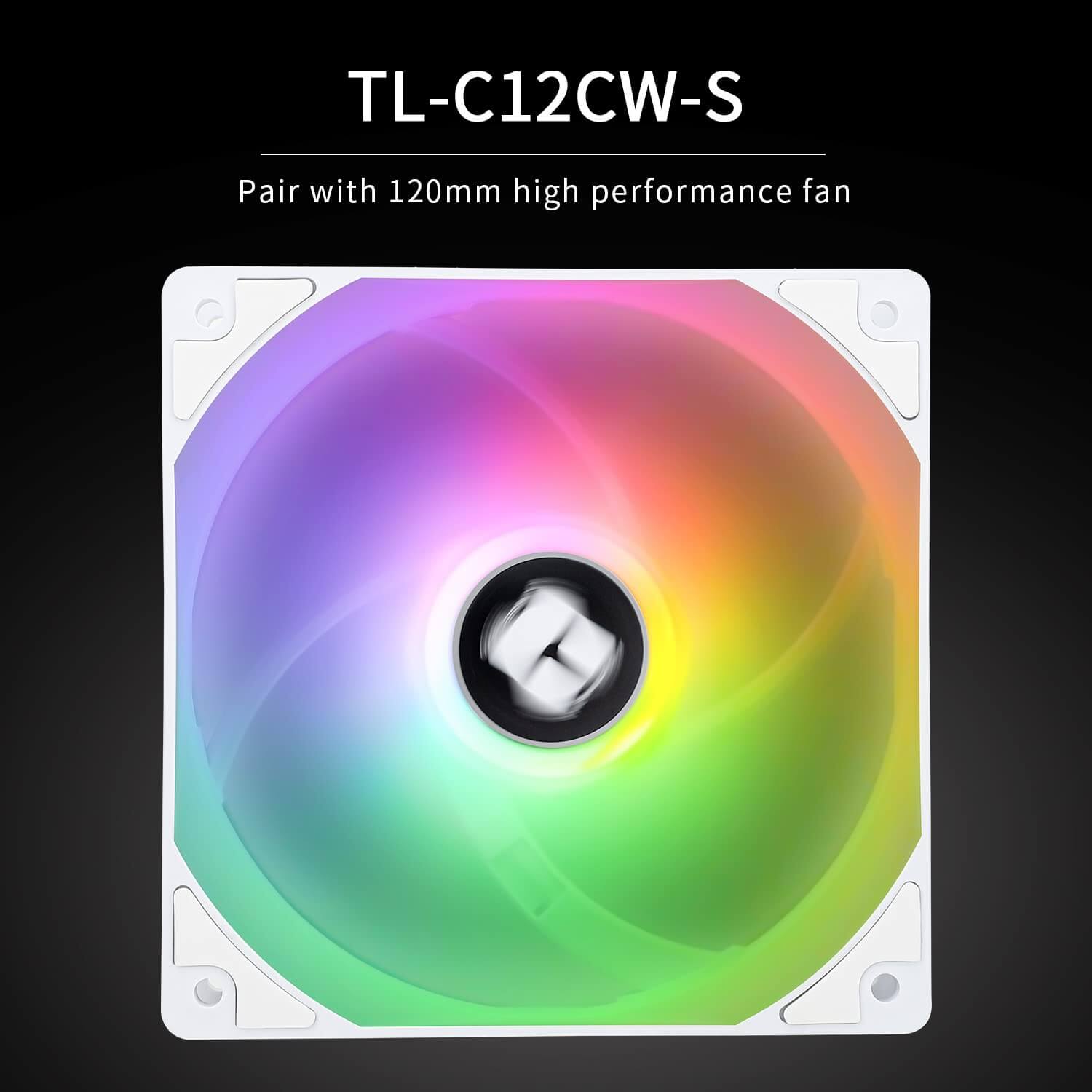 Model:TL-C12C-S; Colorful and gorgeous ARGB light effects; Standard size PWM fan:120x120x25mm (4.72x4.72x0.98 inches); Product weight:0.97kg(2.1lb); fan speed (RPM):1500rpm±10%; power port: 4pin; Voltage:12V; Air flow:66.17CFM(MAX); Noise Level≤25.6dB(A), leave room for memory-chip(RAM), so that installation of ice cooler cpu is unrestricted