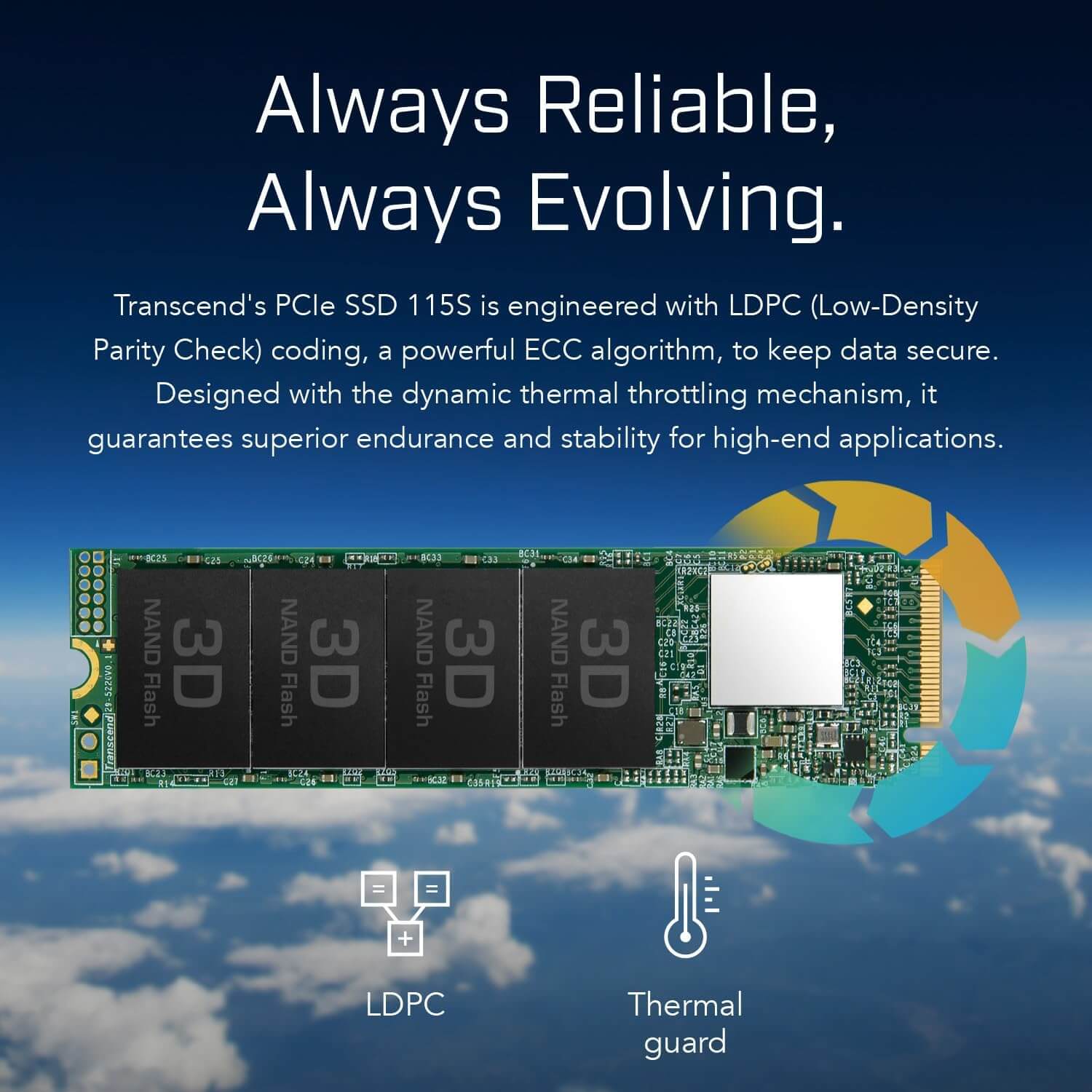 Transcend's PCIe SSD 115S is engineered with LDPC (Low-Density Parity Check) coding, a powerful ECC algorithm, to keep data secure. Designed with the dynamic thermal throttling mechanism, it guarantees superior endurance and stability for high-end applications.