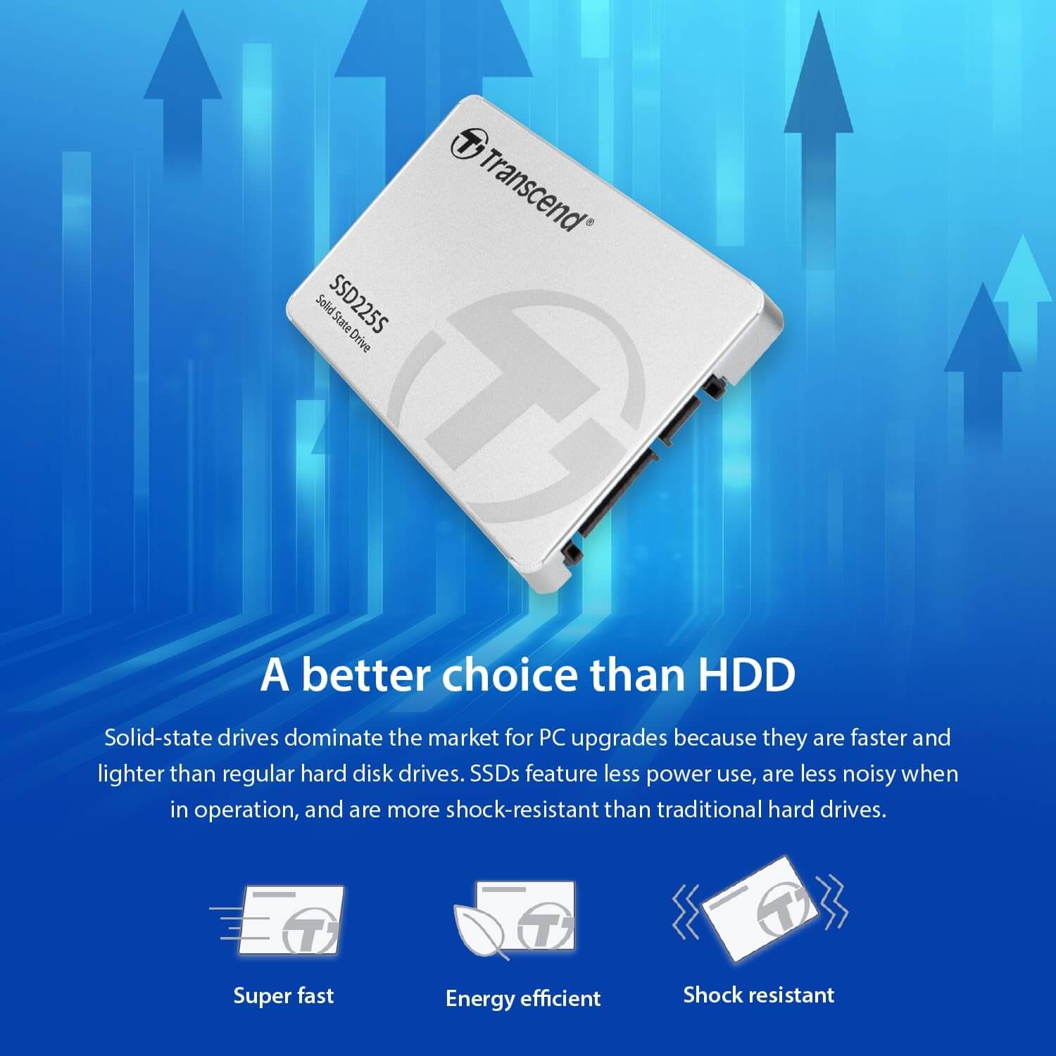 Transcend's SATA III 6Gb/s SSD225S features superior durability and stability, delivering up to 550 MB/s of transfer speeds to upgrade your laptop and desktop! With up to 2TB of storage capacity and firmware optimization, you can save plenty of files without any worries.