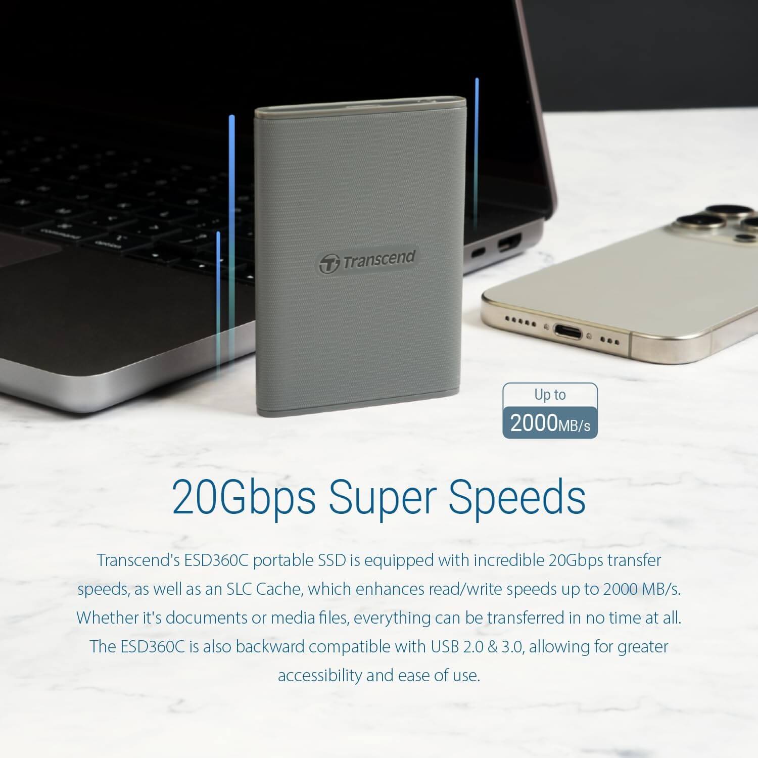 Transcend's ESD360C portable SSD is equipped with incredible 20Gbps transfer speeds, as well as an SLC Cache, which enhances read/write speeds up to 2000 MB/s. Whether it's documents or media files, everything can be transferred in no time at all. The ESD360C is also backward compatible with USB 2.0 & 3.0, allowing for greater accessibility and ease of use.