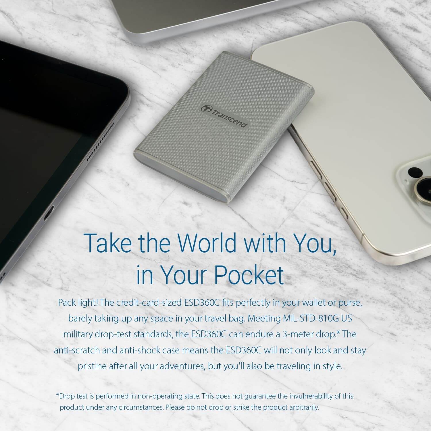 Pack light! The credit-card-sized ESD360C fits perfectly in your wallet or purse, barely taking up any space in your travel bag. Meeting MIL-STD-810G US military drop-test standards, the ESD360C can endure a 3-meter drop.* The anti-scratch and anti-shock case means the ESD360C will not only look and stay pristine after all your adventures, but you'll also be traveling in style.