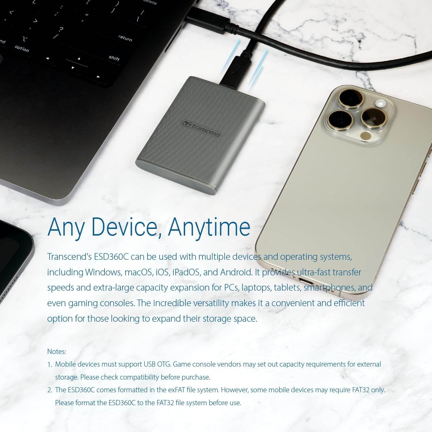 2. The ESD360C comes formatted in the exFAT file system. However, some mobile devices may require FAT32 only. Please format the ESD360C to the FAT32 file system before use.