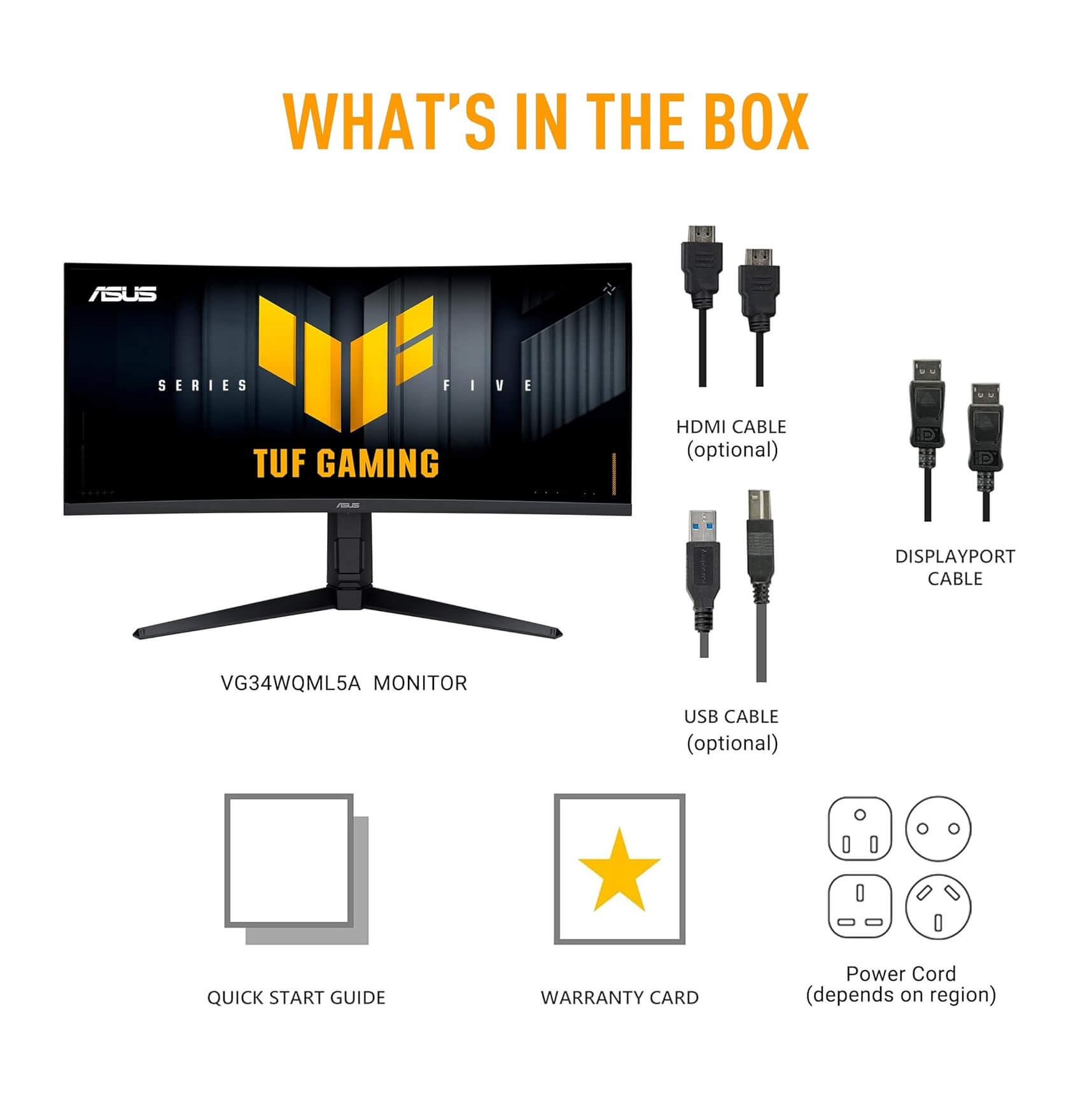 TUF Gaming VG34WQML5A is a 34-inch Ultra Wide QHD (3440 x 1440) 1500R curved gaming monitor that delivers five advanced upgrades for top-tier gaming. It features a lightning-fast 250 Hz refresh rate (OC) and 0.5-millisecond response time.